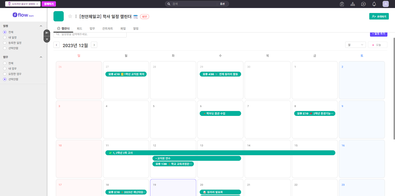 오늘은 이렇게 플로우와 쿨메신저에 대해 알아보았습니다. 학교 행정업무에 있어 이렇게 협업툴 하나로 프로젝트 관리부터 사내 메신저, 파일관리, 일정관리 등의 기능을 올인원으로 사용할 수 있는 플로우를 가장 잘 이용하였으며 학교 업무 효율과 시간적 절감의 결과를 얻을 수 있는 국내 1위의 대표 협업툴이었습니다.